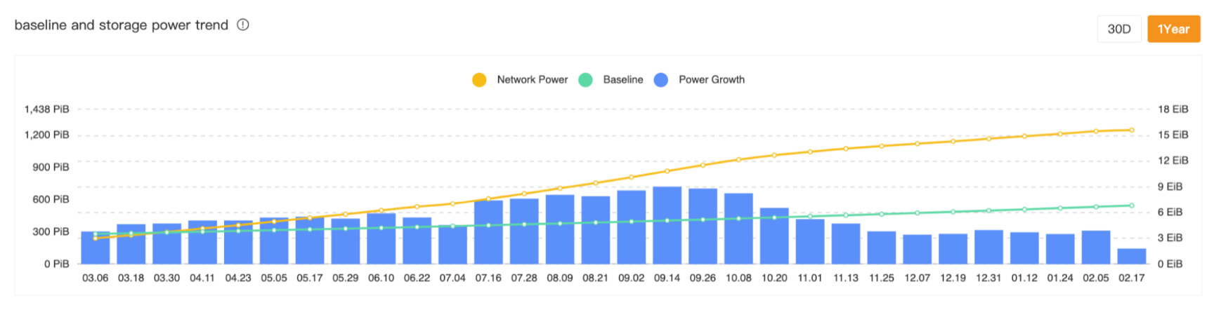 Increase in Filecoin’s Storage Power over the past year (source: https://filscan.io/statistics/power)
