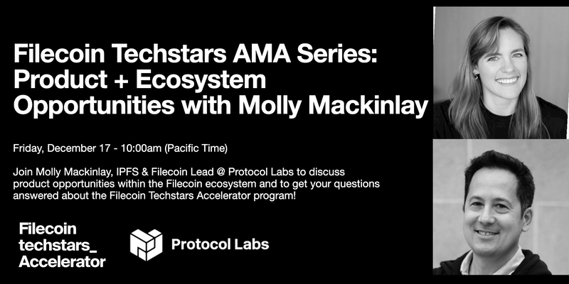 On Friday, December 17th at 10am PST, join Molly Mackinlay, IPFS & Filecoin Lead at Protocol Labs and Isaac Kato, Managing Director of the new Filecoin Techstars Accelerator program to discuss upcoming product and business opportunities within the Filecoin ecosystem and get your questions answered about the upcoming Filecoin Techstars Accelerator program! Register.