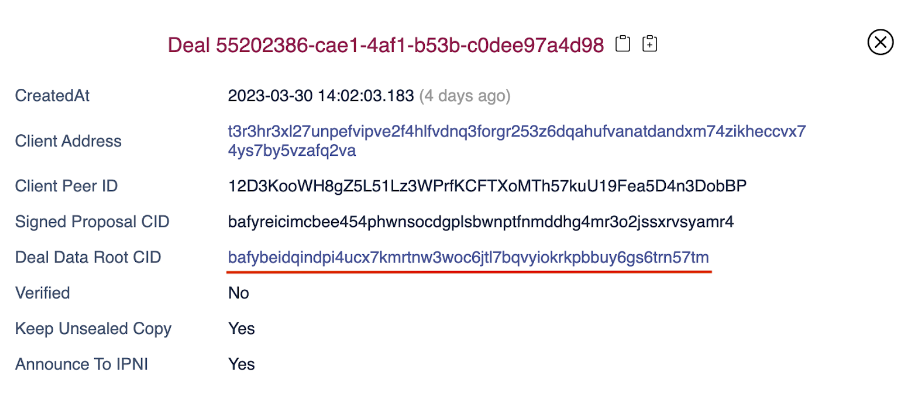 On the detail page for the deal note that the Deal Data Root CID matches the payload CID in the CAR file: