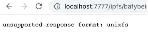 In the curl request above we appended the query parameter format=raw to the URL to get the raw block data for the file. If we try to open the file directly in a web browser, with no extra query parameters, we get an error message: