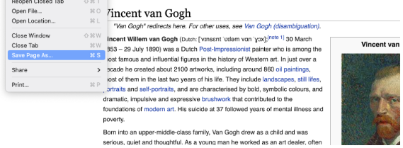 Let’s imagine that we want to serve Vincent Van Gogh’s wikipedia page from our Storage Provider. First let’s go to wikipedia and save the HTML file and assets into a folder on our desktop called vincent.